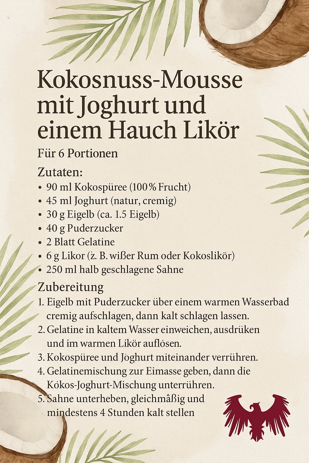 Hier kommt unser Rezept für das Kokosnussmousse.. viel Spaß dabei und lasst gerne ein Feedback da.